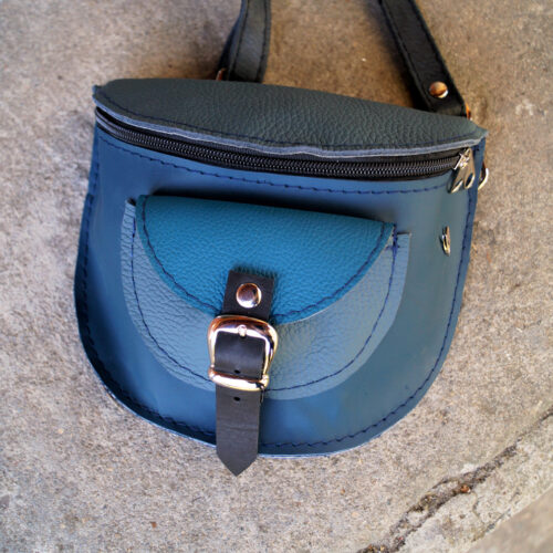 Praktyczna torebka na pas uszyta ze skór naturalnych (licowe i zamszowe) w odcieniach chłodnej zieleni i zielonkawego błękitu . Zdobienia w postaci pasków z motywem azteckim, wzmocnionych od spodu skórą naturalną, Niewielka ale pojemna, pomieści telefon, portfel, chusteczki i najpotrzebniejsze kosmetyki. Z tyłu kieszeń otwarta, a z przodu kieszeń zapinana na magnes. Wewnątrz przegródka. Pasek regulowany, zapinany na karabińczyki. Można ją nosić również na ramieniu. Wymiary: 21/17cm. Czas oczekiwania na uszycie – 7-14 dni roboczych.